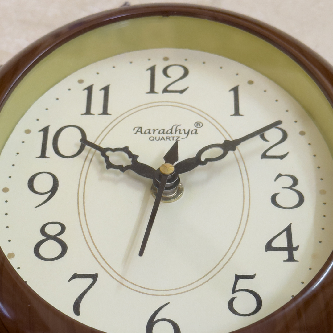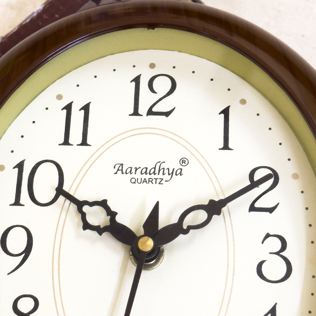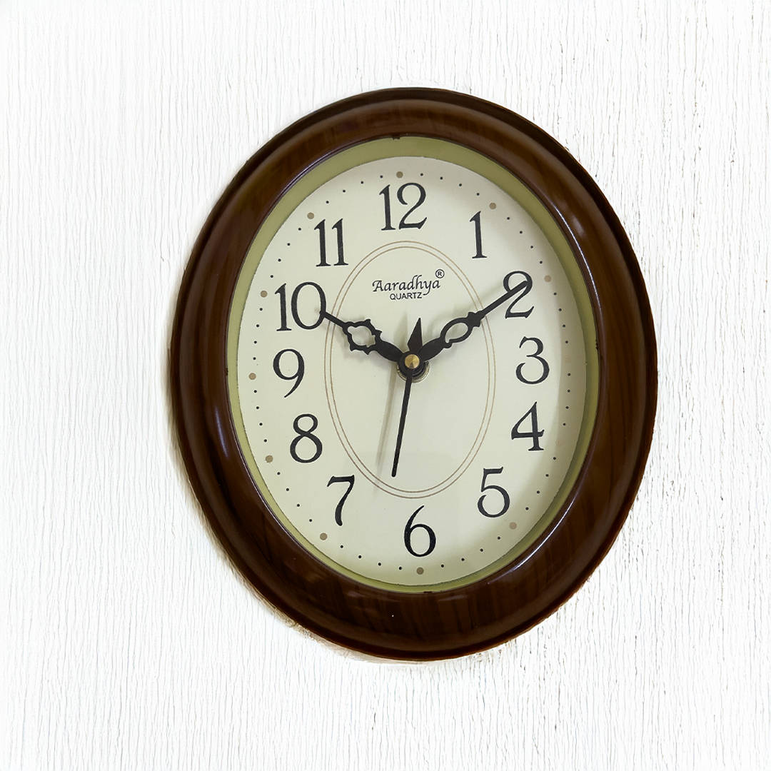 A battery operated wall clock with round frame for hall, office , bedroom,kitchen. The oval dial with wood colour classical frame