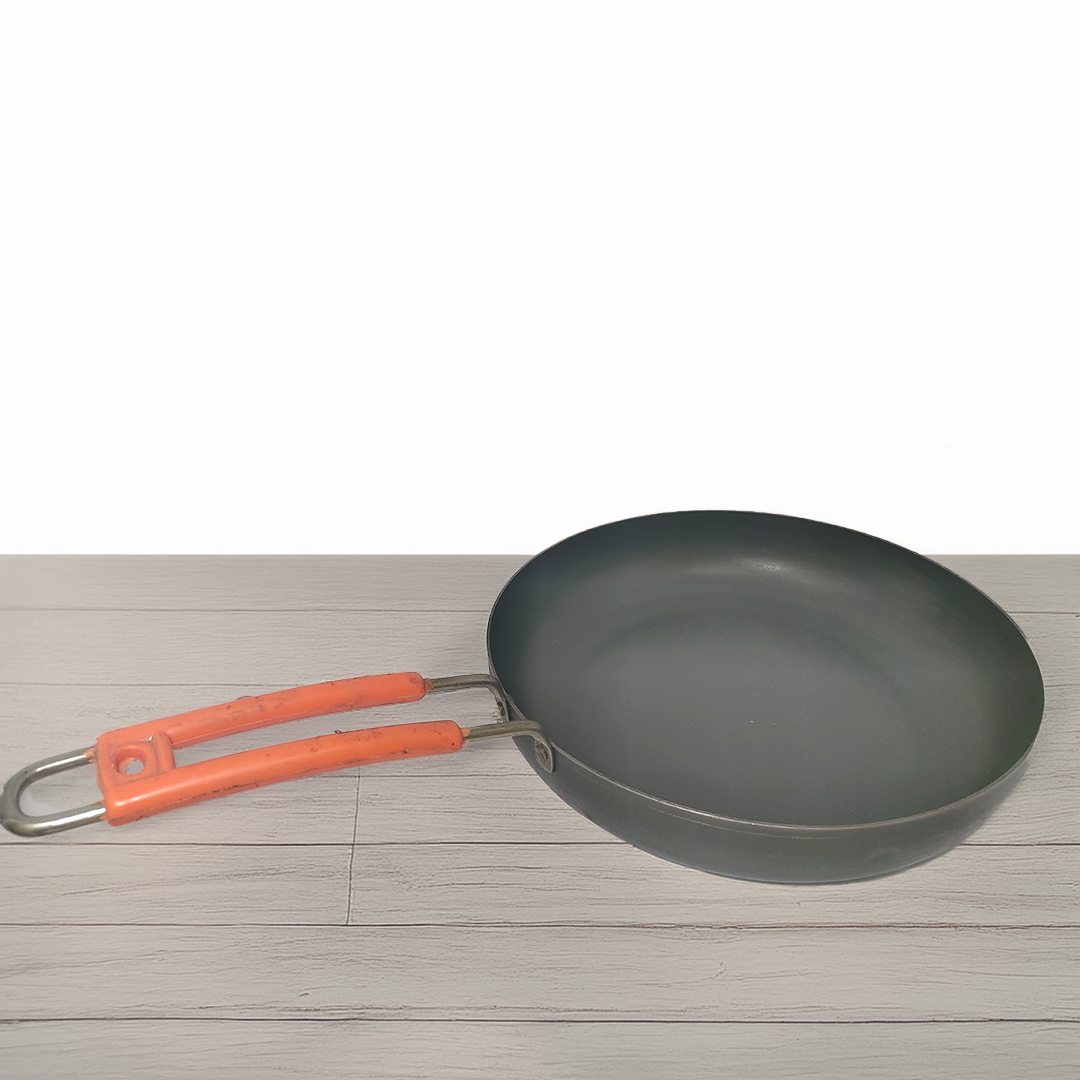 A pure iron pan .Perfecrtly suitable for all home, with a strong plastic handle suitable for cooking/ frying. Not suitable for